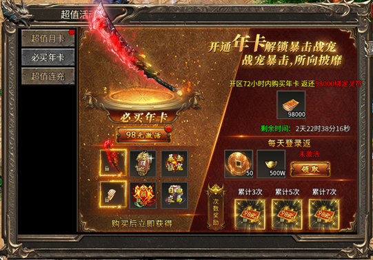 三,必买年卡活动内容:活动时间内,开通激活年卡可获得对应奖励,每日登录还可以返还元宝等。